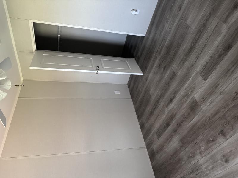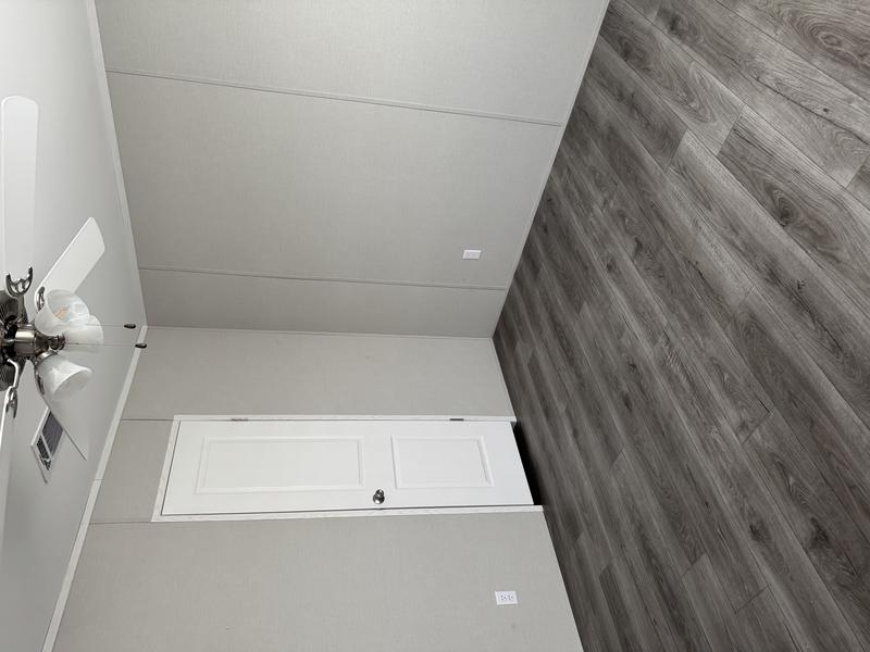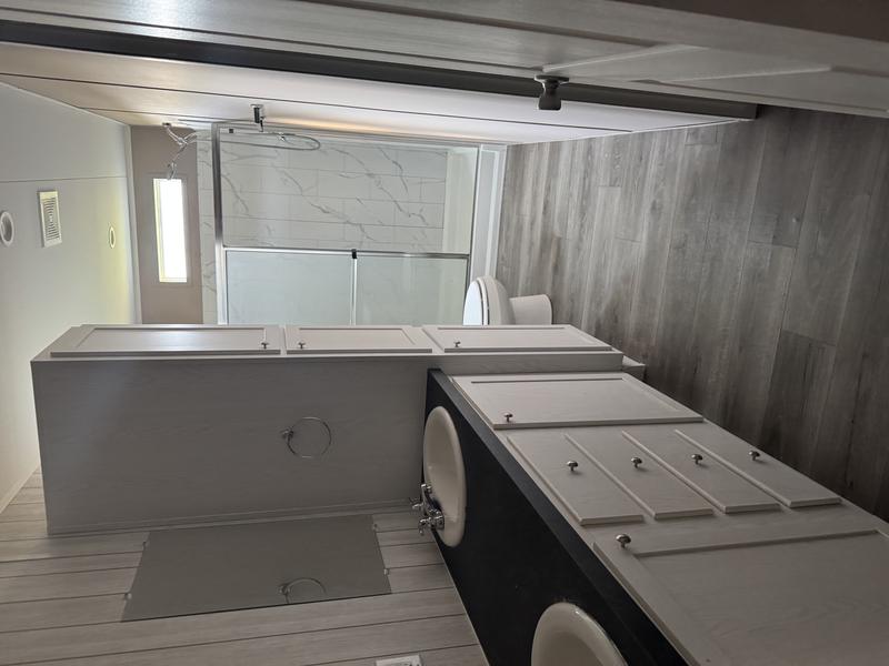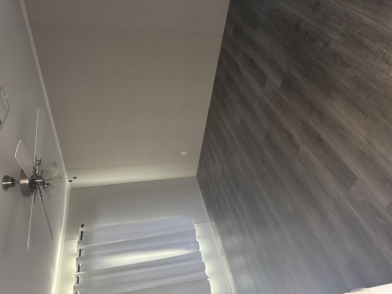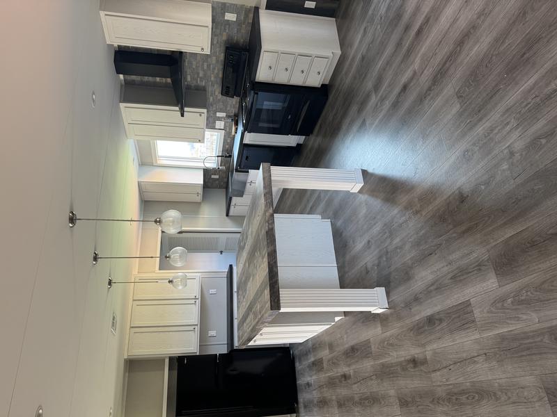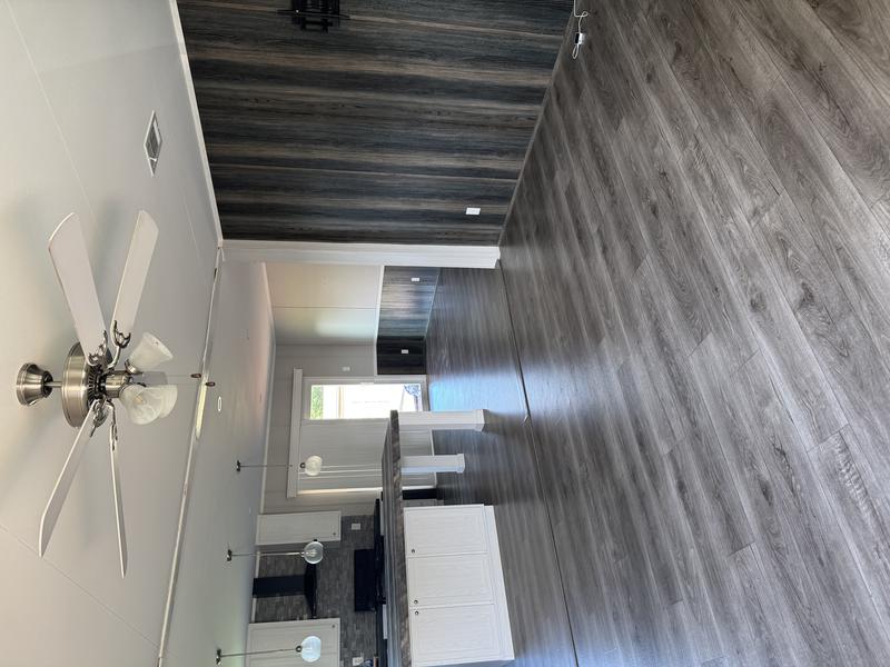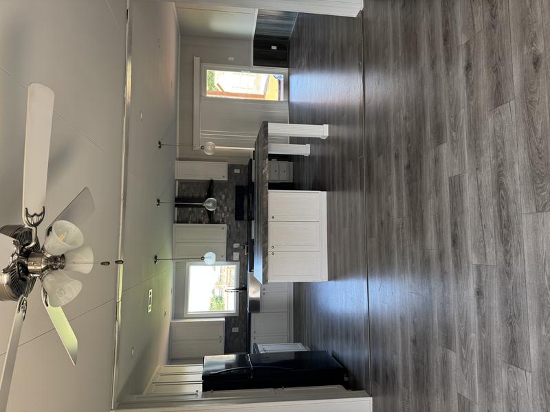 * Kitchen with new cabinets, countertops, laminate flooring, wooden ceiling with recessed lighting